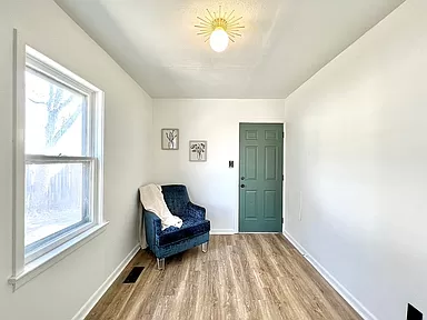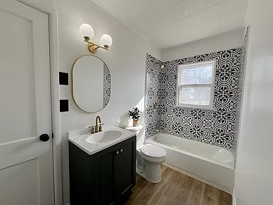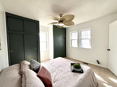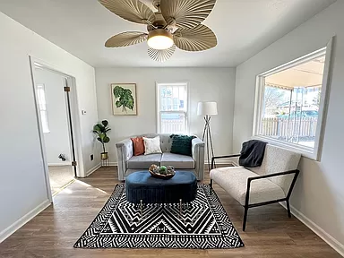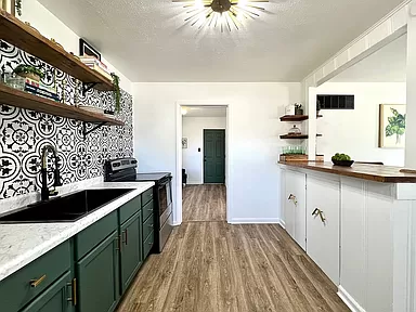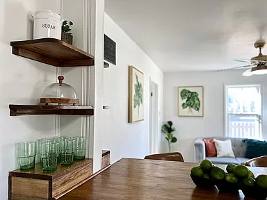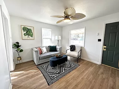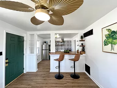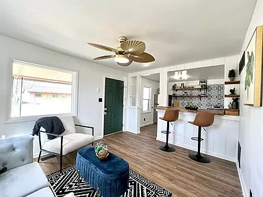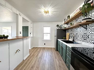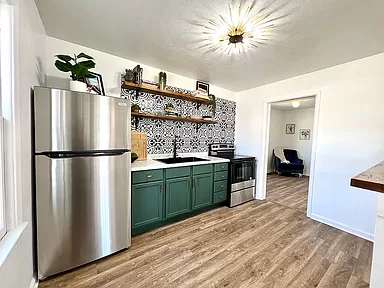 A 1920’s renovated Bungalow full of mid-century charm ready for its next chapter of owners. This quaint one 1 bed, one 1 bath home offers all of the amenities necessary for everyday life, as well as simplicity and personality. The open concept kitchen and living room is perfect for hosting a brunch for friends or a quiet night in for two. The kitchen showcases black & white decorative wall tile that flows behind open shelving, anchored by emerald cabinetry, gold hardware & vibrant gold light fixtures that are sure to make a statement. The bathroom follows suit with a fully tiled bath/shower, emerald vanity and continued gold fixtures & hardware. The large laundry room leaves opportunity a nook, pantry &/or storage and leads to a spacious & private oversized backyard with patio, shed and plenty of room to run. The bedroom provides two floor-to-ceiling closets encased in green and showcasing the gold-leaf ceiling fan & fixture. Whether downsizing, looking for a simpler lifestyle, or beginning your first chapter on your own, the Bungalow offers opportunity to all lifestyles.